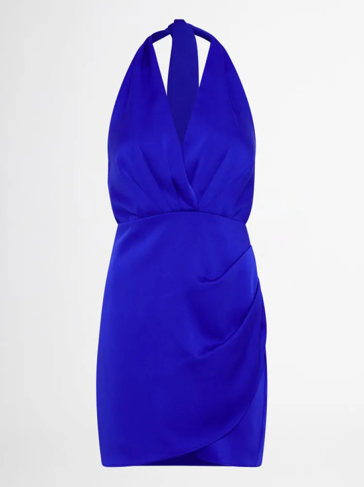 Inject Some Colour Into A Silhouette That Never Goes Out Of Style! Our Annika Mini Dress Showcases A Satin Fabrication, Halter Neckline And Pleats At Side Front Skirt. Pair With Our Halo Earrings To Complete The Look.