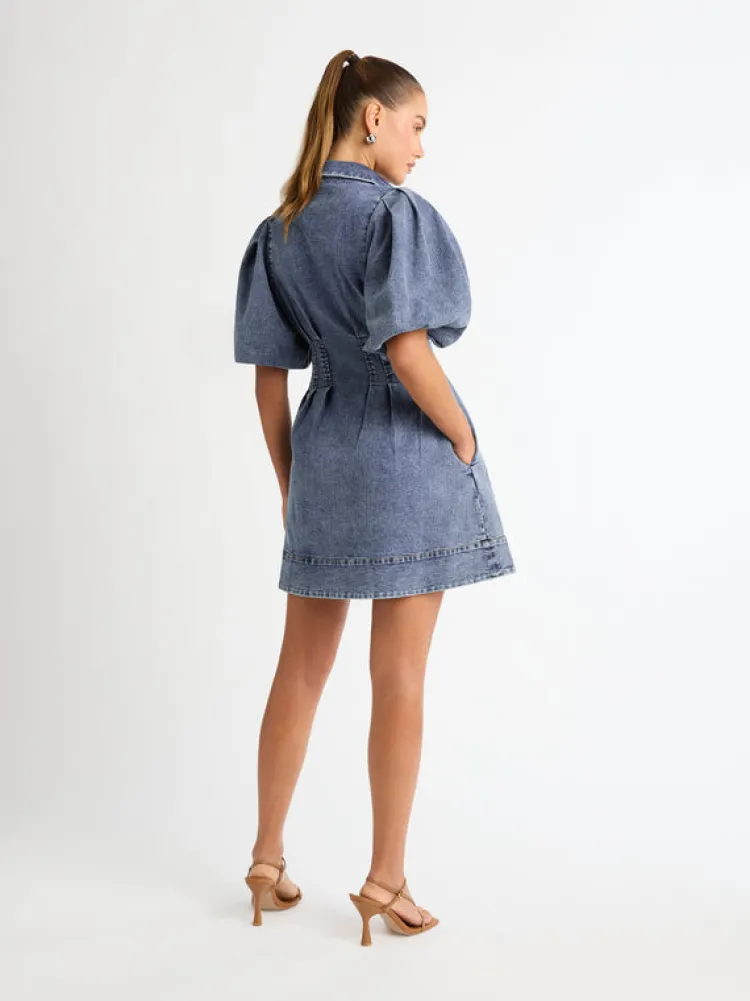 Introducing The Blaire Mini Dress – A Captivating Blend Of Flirtatious Charm And Contemporary Elegance. This Dress Is Designed To Make A Statement, Offering A Versatile And Stylish Option For All Occasions. Showcasing A Stretch Denim Fabrication, Relaxed Styling, Collar Neckline, Pleats At Waistline And Mini Skirt Length. Pair With Our Sphere Stud Earrings To Complete The Look.