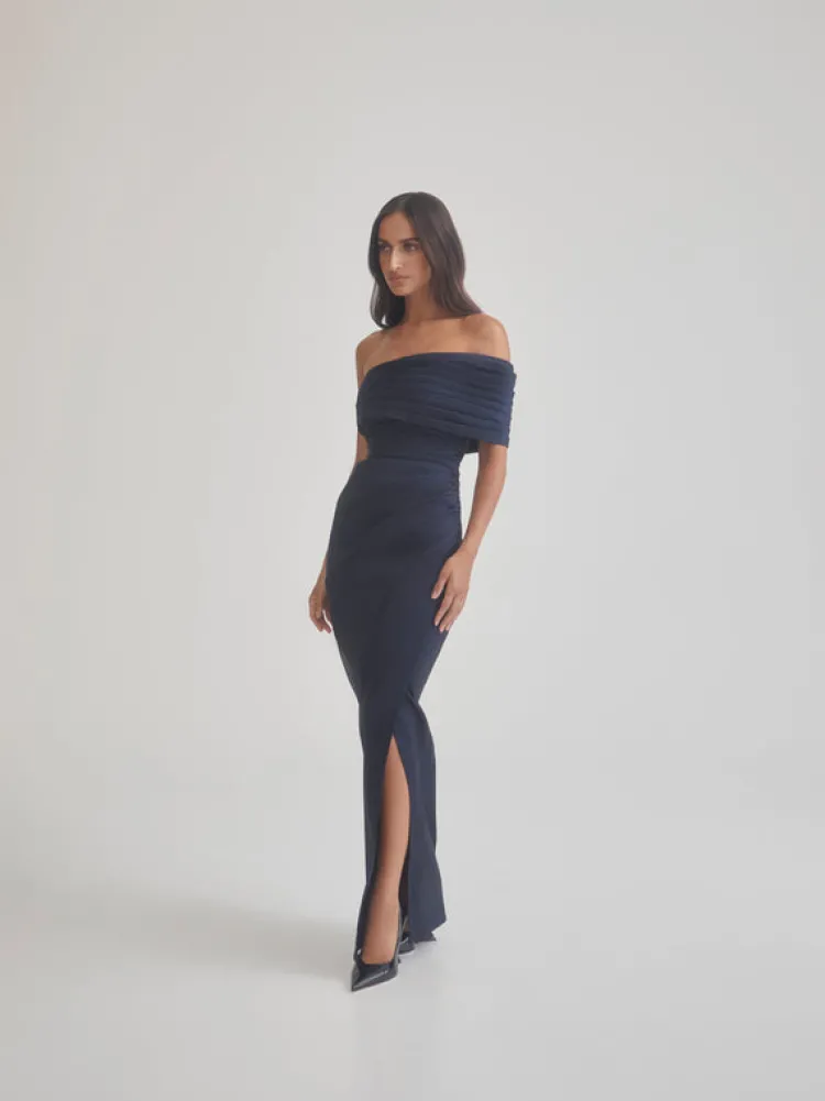 Designed To Honour The Shape Of The Female Form, This Piece Has Been Carefully Constructed To Have An Innate Movement To It; Perfectly Draped And Wrapped To Fit. Introducing The Giselle Gown – Showcasing A Fitted Styling, Stretch Taffeta Fabrication, One Shoulder Strap, Pleating Throughout Dress And Invisible Center Back Zipper. Pair With Our Sphere Stud Earrings To Complete The Look.