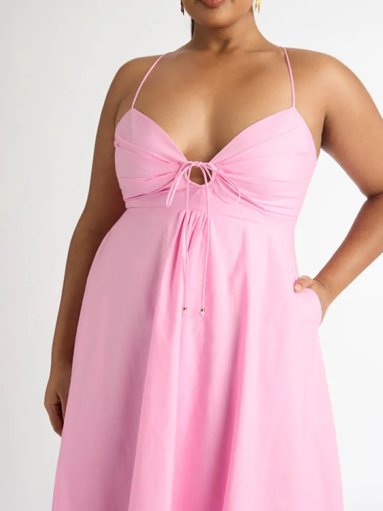 A Moment In Pink – Introducing The Isabel Midi Dress. Showcasing A Relaxed Fit, Low Neckline With Centre Front Circle Cut Out, Multiway Straps And Midi Length Skirt. Pair With Our Bloom Earrings To Complete The Look.