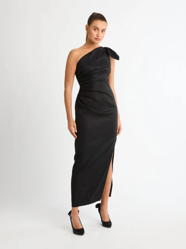 Make A Lasting Impression. Introducing The Kennedy Dress – Showcasing A Fitted Cut, One Shoulder Strap With Self Tying Knot And Side Seam Split. Pair With Our Sphere Stud Earrings To Complete The Look.