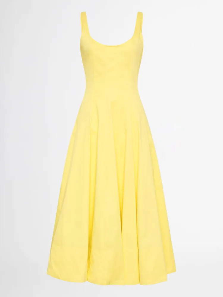 Indulge In Energised Yellow Hues This Season With The Magnolia Midi Dress – Showcasing A Fitted Cut, A-Line Midi Skirt, Scoop Neckline And Side Seam Pockets. Pair With Our Lotus Earrings To Complete The Look.