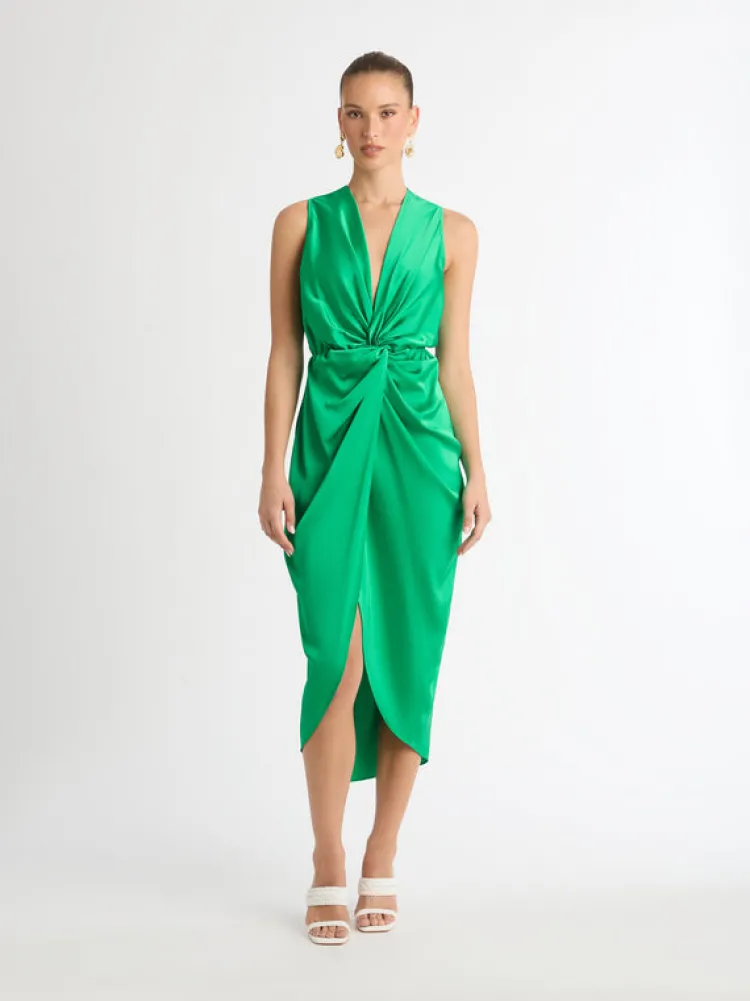 Indulgent Emerald Hues And Draping Satin Silhouettes Make Up The Vibrant Universal Dress. Showcasing A V Neckline, Front Twist Knot Detailing An Overlay Skirt And Elasticated Half Back Waist. Pair With Our Rival Earrings To Complete The Look.