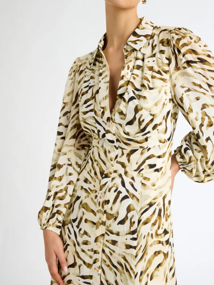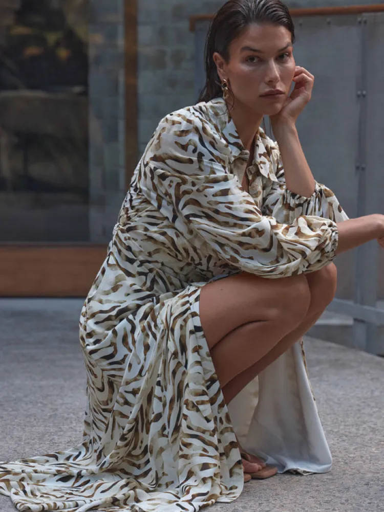 Introducing The Sahara Maxi Dress – An Exotic And Alluring Piece That Brings A Touch Of The Wild To Your Wardrobe. This Statement-Making Dress Is Designed For The Modern Woman Who Embraces Her Adventurous Spirit And Loves To Make A Statement. Featuring A Woven Print Fabrication, Collar Neckline With Front Button Placket, Maxi Length Style, Side Seam Pockets And Rouleau Belt With Gold Toggle Ends. Pair Back With Our Juliet Earrings To Complete The Look.
