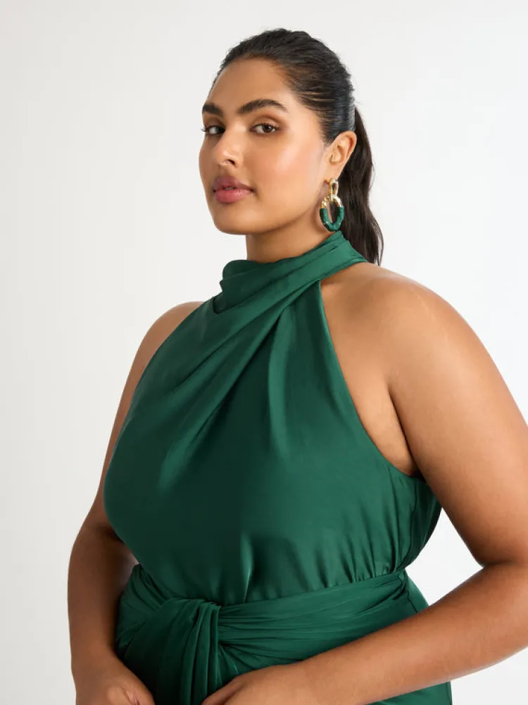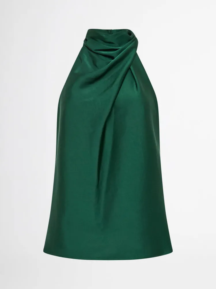 Effortless Silhouettes In Calming Deep Green Tones. Introducing The Stella Top – An Elegant Satin Top Showcasing A Relaxed Fit And A High Neckline With A Cowl Style Cut. Pair With Our Stella Skirt And Mali Earrings To Complete The Look.