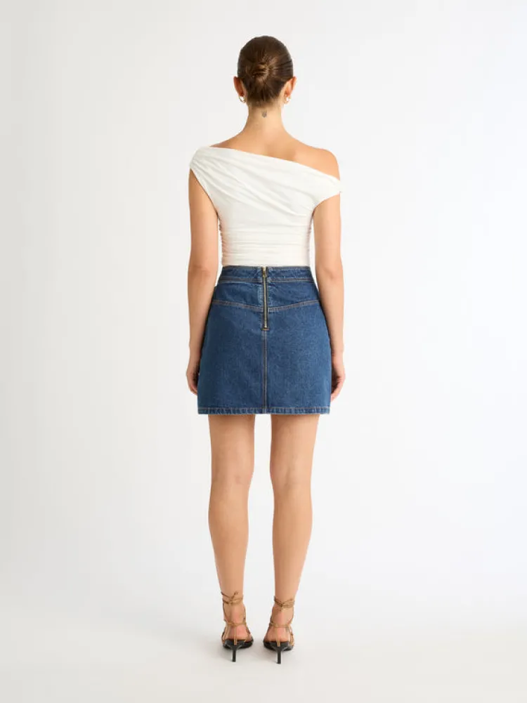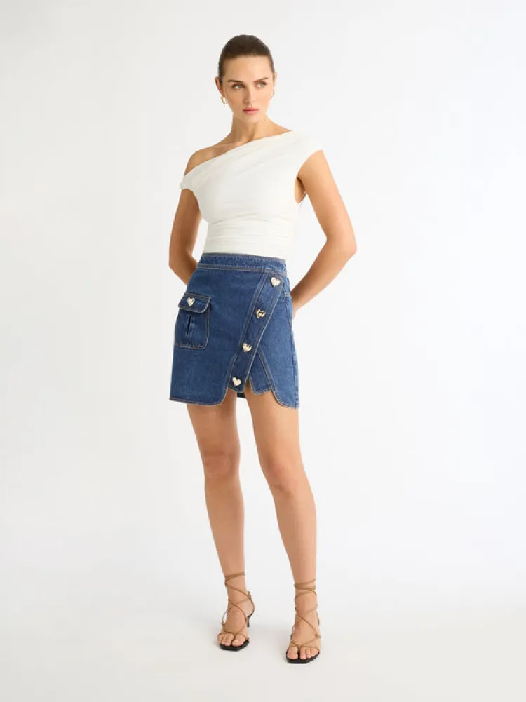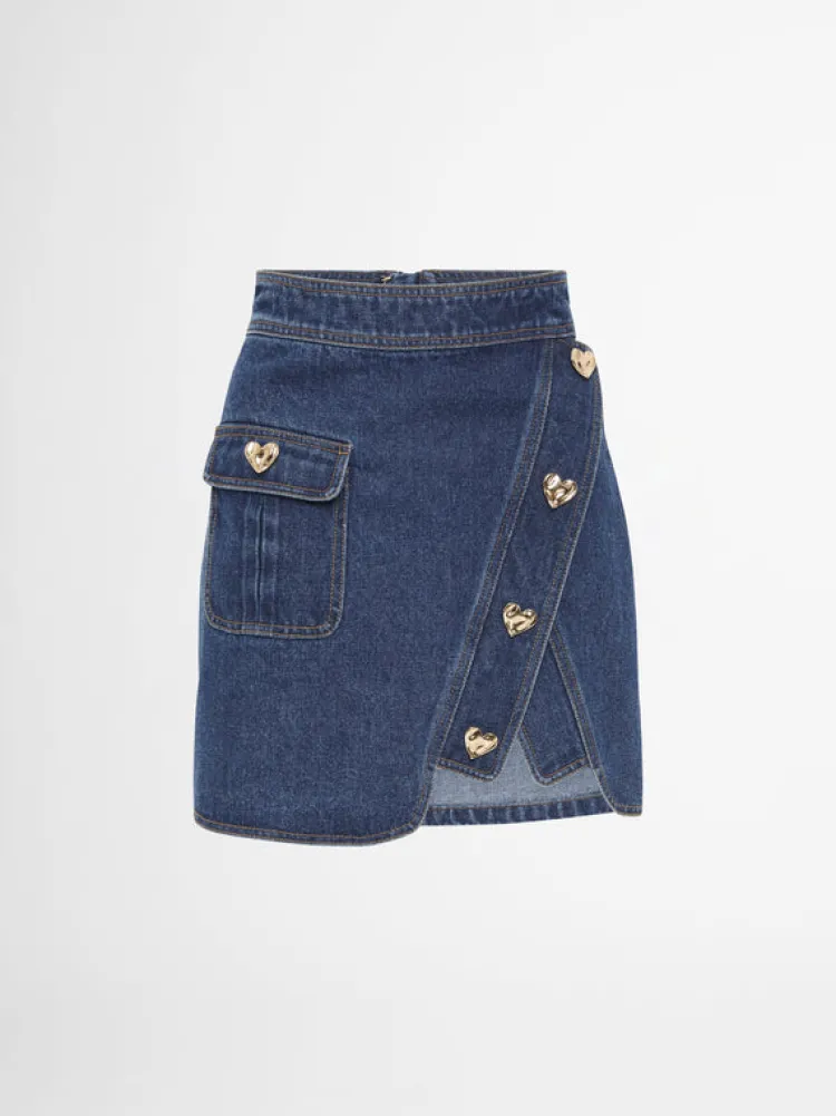 A Denim Moment Sure To Make Your Heart Beat. Introducing The Heart Republic Denim Skirt – Showcasing A Fixed Waist, Gold Love Heart Contrast Buttons And Patch Pocket. Pair With Our Matching Heartbreak Denim Jacket And Calista Bodysuit To Complete The Look.