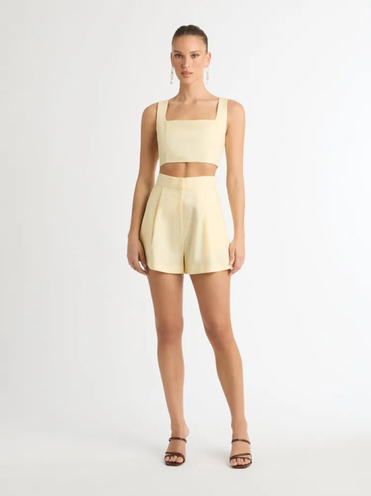 Minimalist Styling And Soft Buttery Tones Make Up The Effortless Lexi Crop Top. Showcasing A Decadent Linen Fabrication This Cropped Top Features A Fitted Cut With A Ruched Back Panel And Square Neckline. Pair With Our Mila Cargo Pant And Cindy Earrings To Complete The Look.