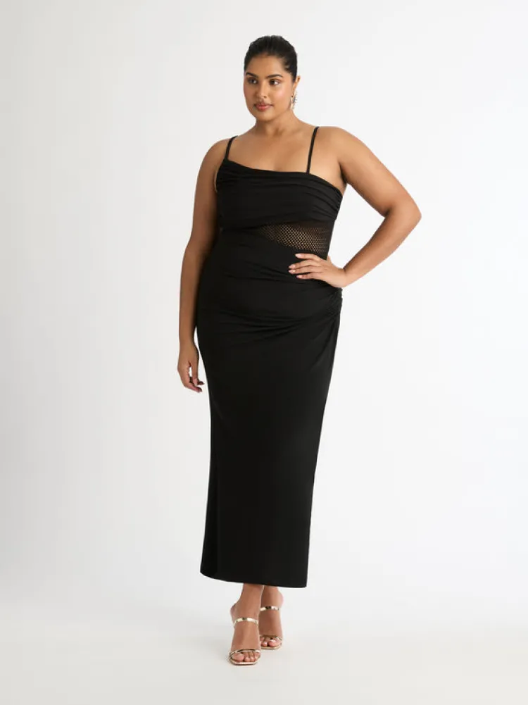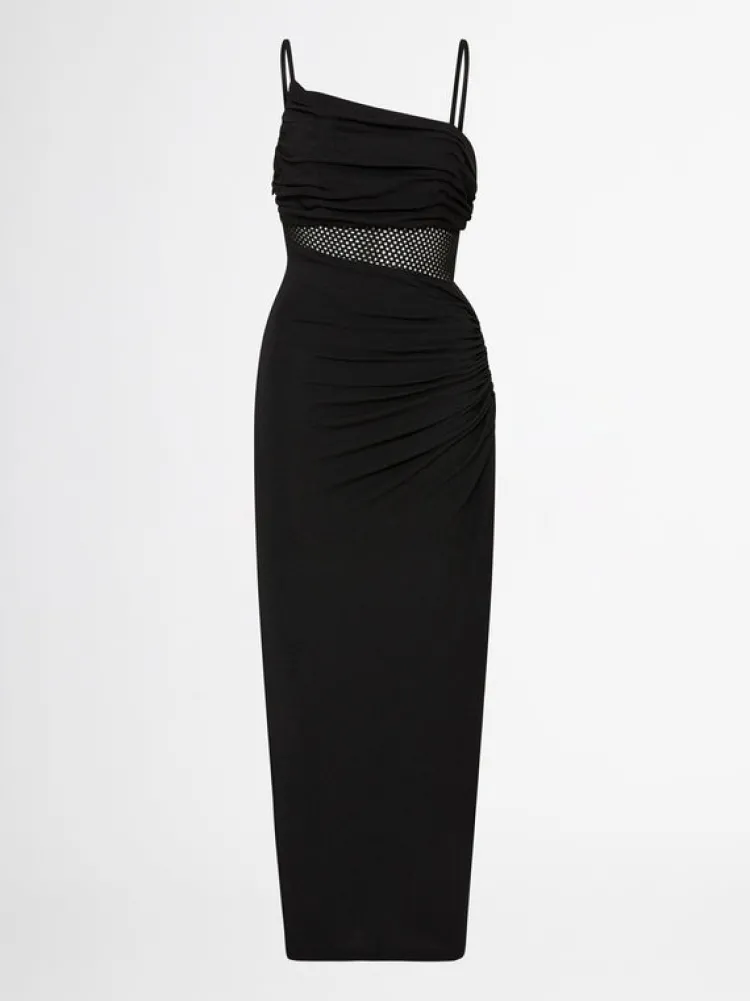A Twist On A Classic, For The Contemporary Woman. Introducing The Amalia Maxi Dress – Showcasing An Asymmetrical Neckline With Adjustable Straps, Ruched Bodice And And A Mesh Cut Out Panel At Waist. Pair With Our Solace Earrings To Complete The Look.