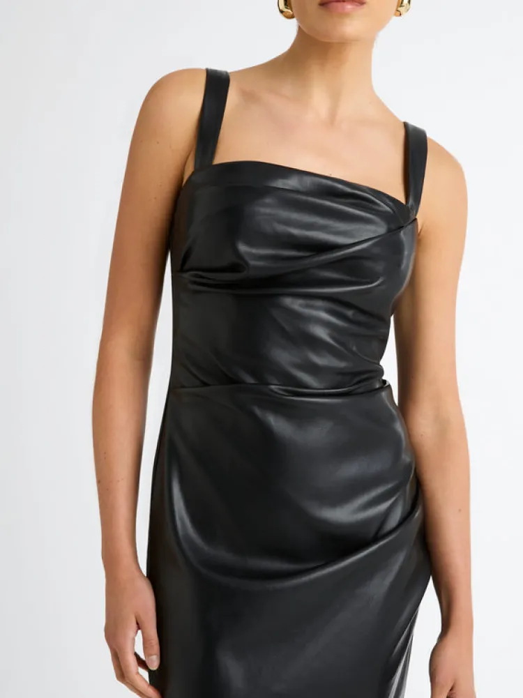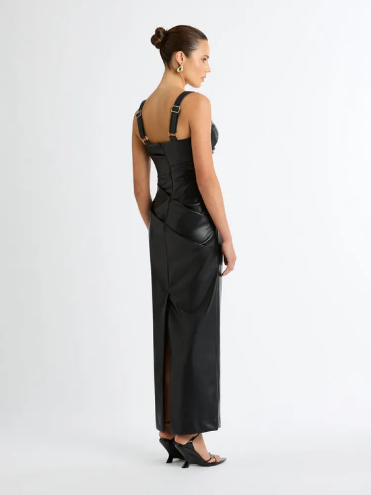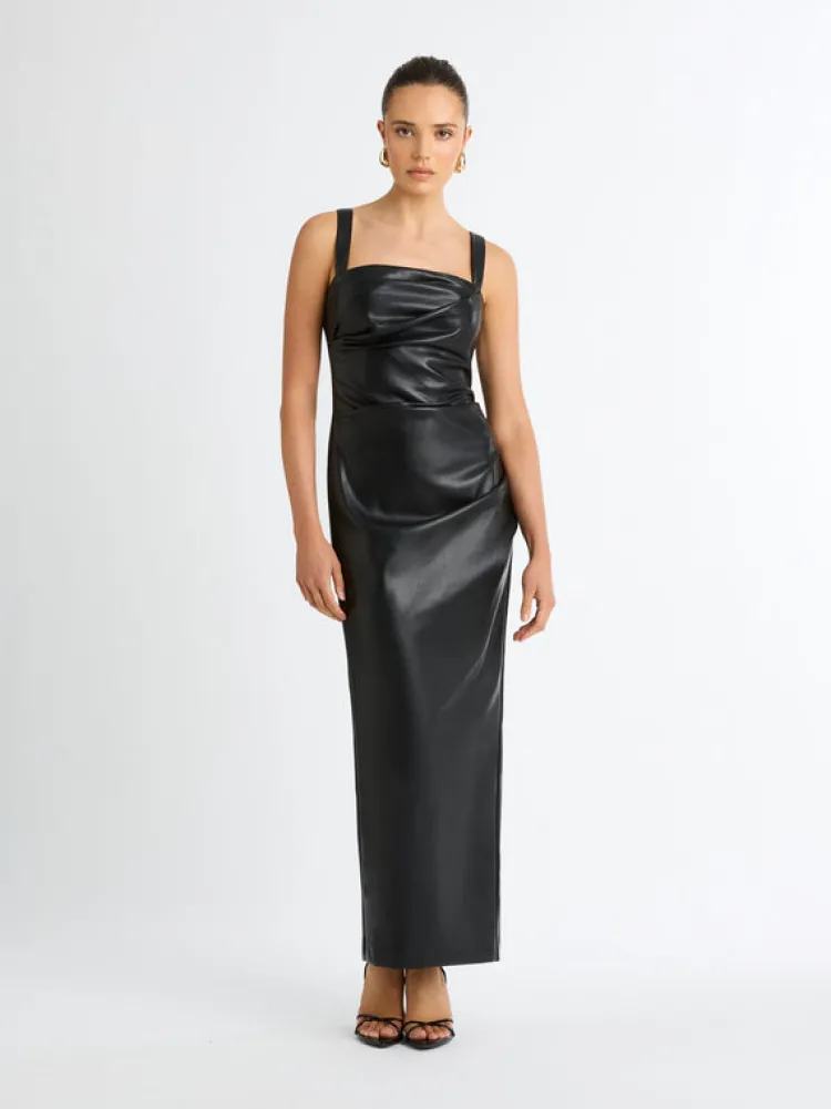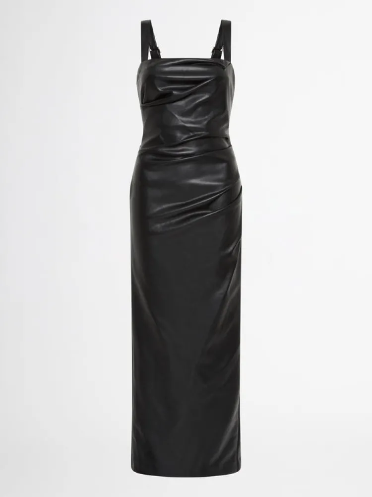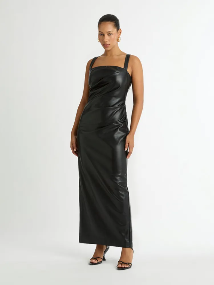 An Effortlessly Polished Look For Any Occasion. Introducing The Amsterdam Maxi Dress – Showcasing A Pu Faux Leather Fabrication, Fitted Cut, Thick Adjustable Straps, Side Seam And Bodice Pleats And A Maxi Length. Pair With Our Manhattan Earrings To Complete The Look.