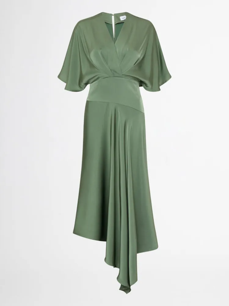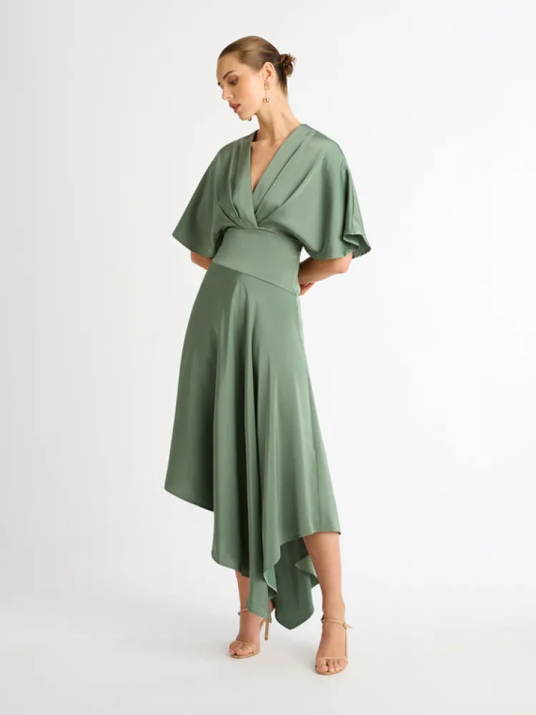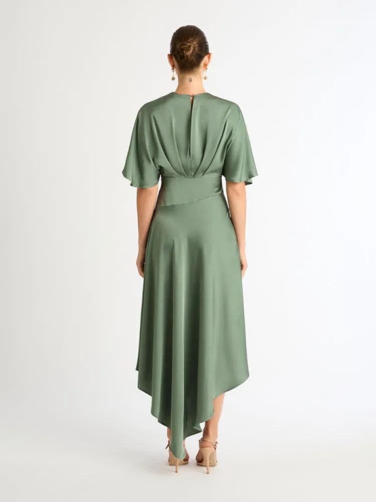 Make A Lasting Impression With The Angelic Maxi Dress. Featuring A Satin Woven Fabrication, V Cross Over Neckline, Pleats At Front And Back Bodice, Bat Wing Style Sleeves, Side Seam Invisible Zipper And Bias Skirt. Pair Back With Our Noelle Earrings To Complete The Look.