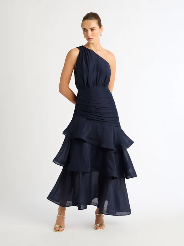 Stand Out At Your Next Event In Striking Ink Hues And Larger Than Life Bows. Introducing The Casablanca Dress, Showcasing A Fitted Cut, Ruffled Layered Skirt, Gathering Detail On Bodice And Detachable Bow. Pair With Our Rashida Earrings To Complete The Look.