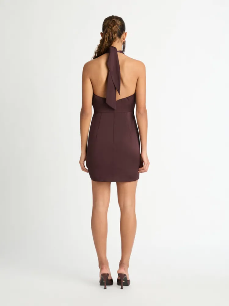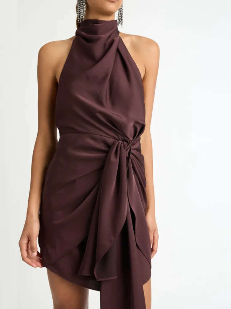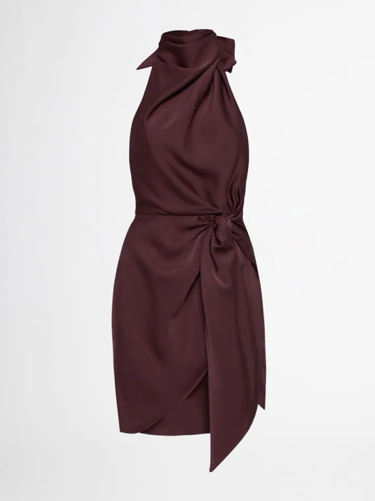 Ignite The Flame – Introducing The Eternal Flame Dress, Showcasing A Luxe, Fiery Design Which Features A Tie Back Halter Neck, Half Elastic Back Waist And Mock Wrap Mini Skirt. Pair With Our Hailey Earrings To Complete The Look.
