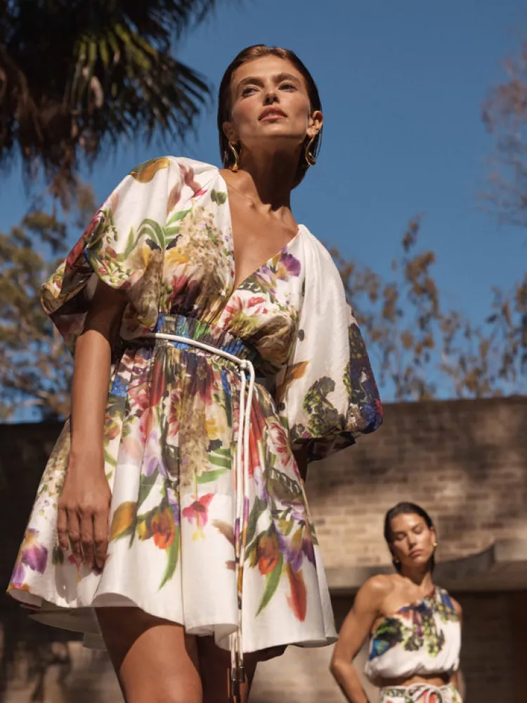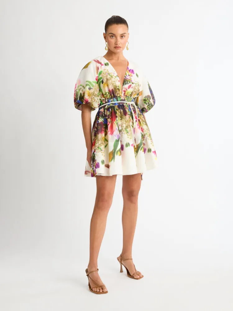 The Garden Party Awaits! Introducing The Impression Mini Dress – Showcasing 3/4 Balloon Sleeve, An Elasticated Waist, Self Fabric Cord Waist Tie With Metal Toggle Ends, Side Hip Insert Pockets And An A-Line Mini Skirt. Style With Our Alexis Earrings To Complete The Look.