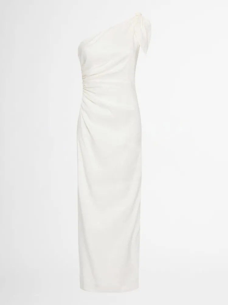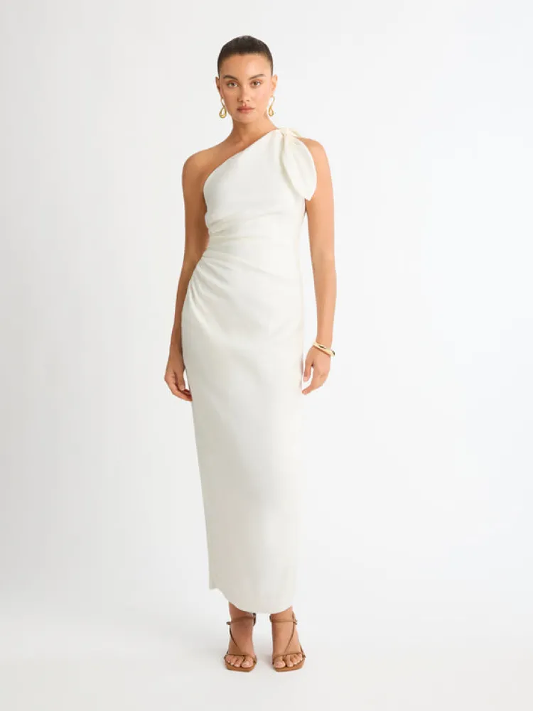 Make A Lasting Impression. Introducing The Kennedy Dress – Showcasing A Fitted Cut, One Shoulder Strap With Self Tying Knot And Side Seam Split. Pair With Our Alexis Earrings To Complete The Look.