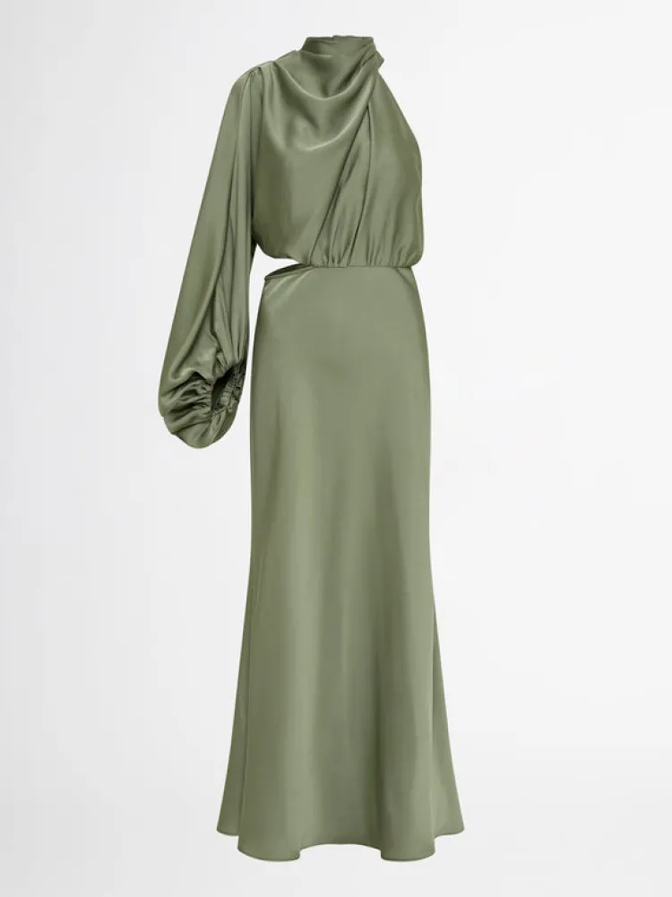 The Statement Dress Of The Season Is Back! Introducing Our Olivia Maxi Dress In A Calming Sage Colourway. Featuring A Heavyweight Matt Satin Fabric, High Neck Cut, Back Neck Tie Opening And Side Waist Cut Out. Pair With Our Jolie Earrings To Complete The Look.