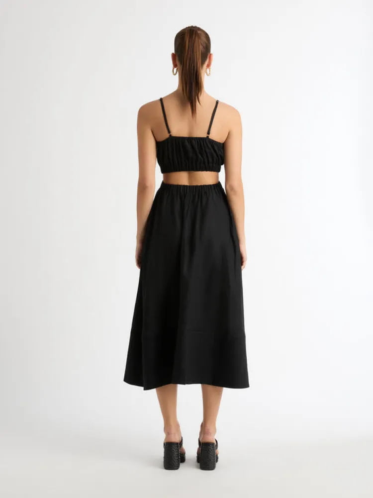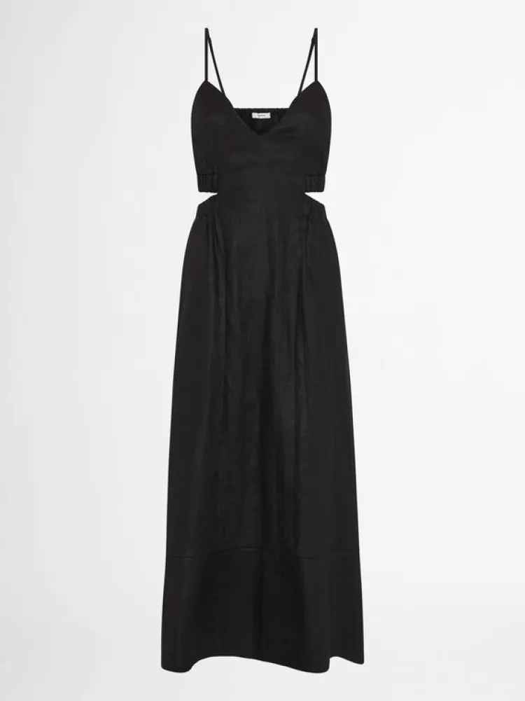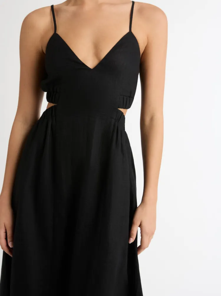Introducing The Rhodes Midi Dress, Your Go-To Summer Linen Dress. Showcasing A Relaxed Fit With Back Waist Cut Outs, Adjustable Straps, Elasticated Back And Side Seam Pockets. Pair With Our Portofino Earrings To Complete The Look.