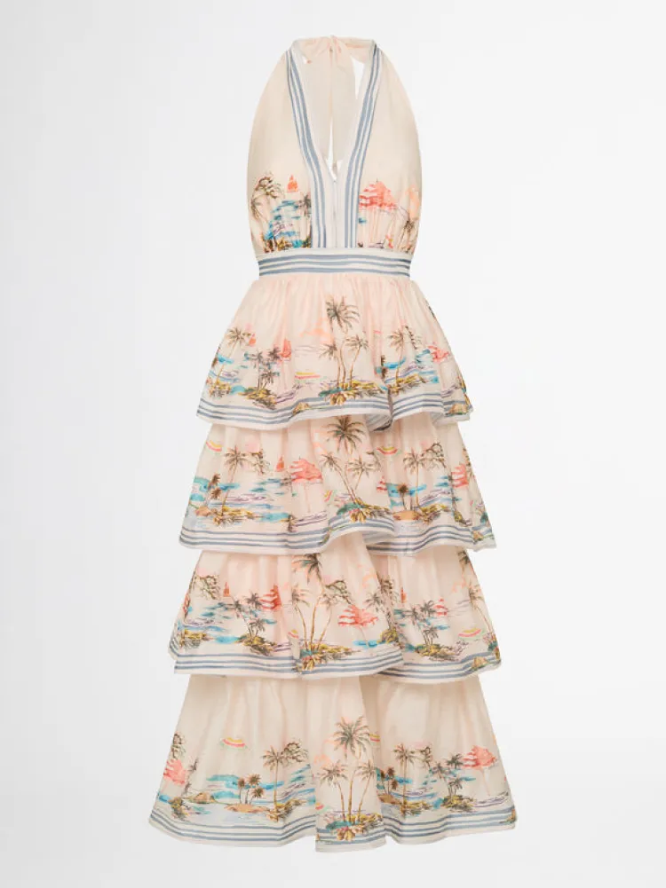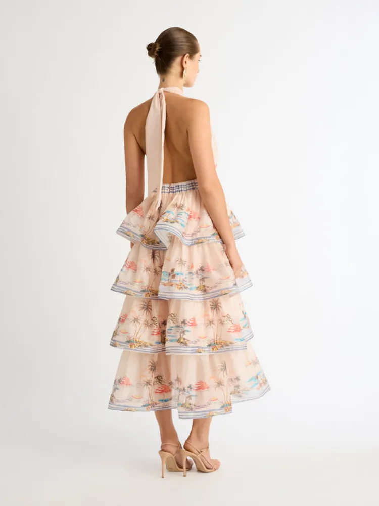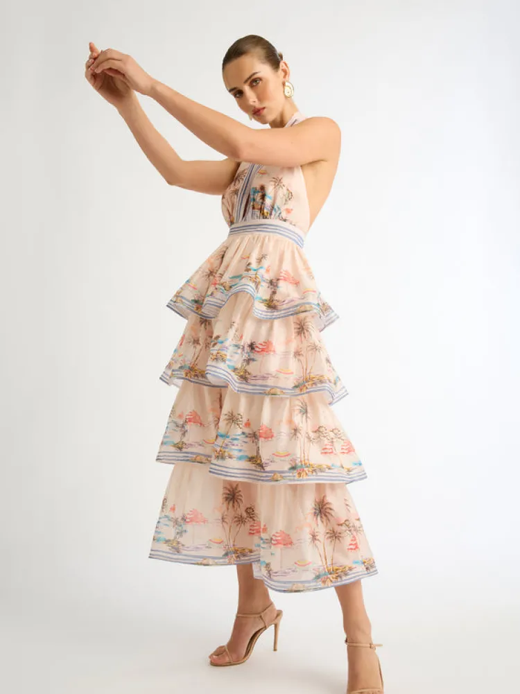 A Vision In Print. Introducing The Riviera Maxi Dress, Showcasing A Relaxed Fit, Halter Neck With Back Tie, Half Elasticated Back Waist And Tiered Layered Maxi Skirt. Pair With Our Seaside Earrings To Complete The Look.