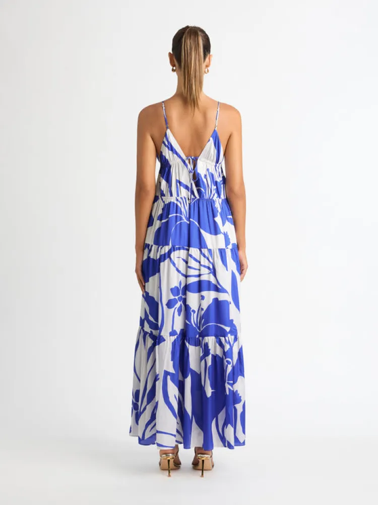 Blooming Blue Florals Meet Lux Satin Finishes. Introducing The San Antonio Maxi Dress – Showcasing A Relaxed Fit, Low Neckline With Thin Adjustable Straps, An Elasticated Waist, Tiered Skirt And Side Seam Pockets. Pair With Our Emily Earrings To Complete The Look.