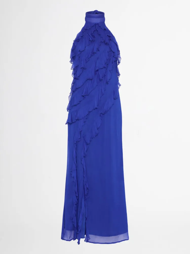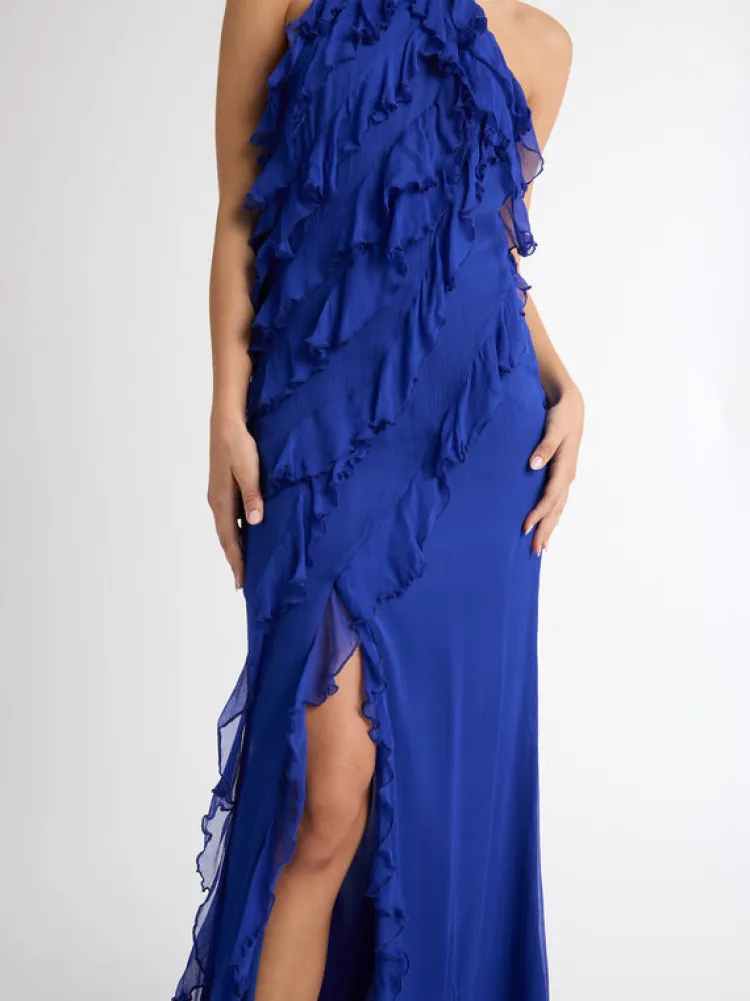 Have Your Moment In The Intricately Crafted Simone Maxi Dress – Showcasing A Fitted Cut, Halter Neckline, Cascading Ruffle Detailing Throughout Bodice And Front Split. Pair With Our Shoreline Earrings To Complete The Look.