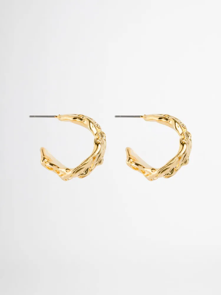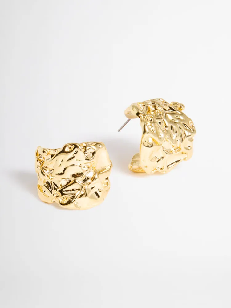 A New Era For The Classic Hoop. Introducing The Cyah Earrings – A Hammered Metal Half Hoop Earring In Gold Hardware.