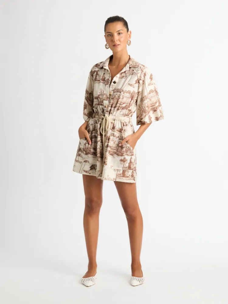 Lose Yourself In The Detailed World Of The Oasis Playsuit. With An Alluring Desert Backdrop This Lightweight Playsuit Features A Relaxed Fit, Elasticated Waist With Internal Rope Cords, Front Patch Pockets And Short Sleeves. Pair With Our Halo Earrings To Complete The Look.