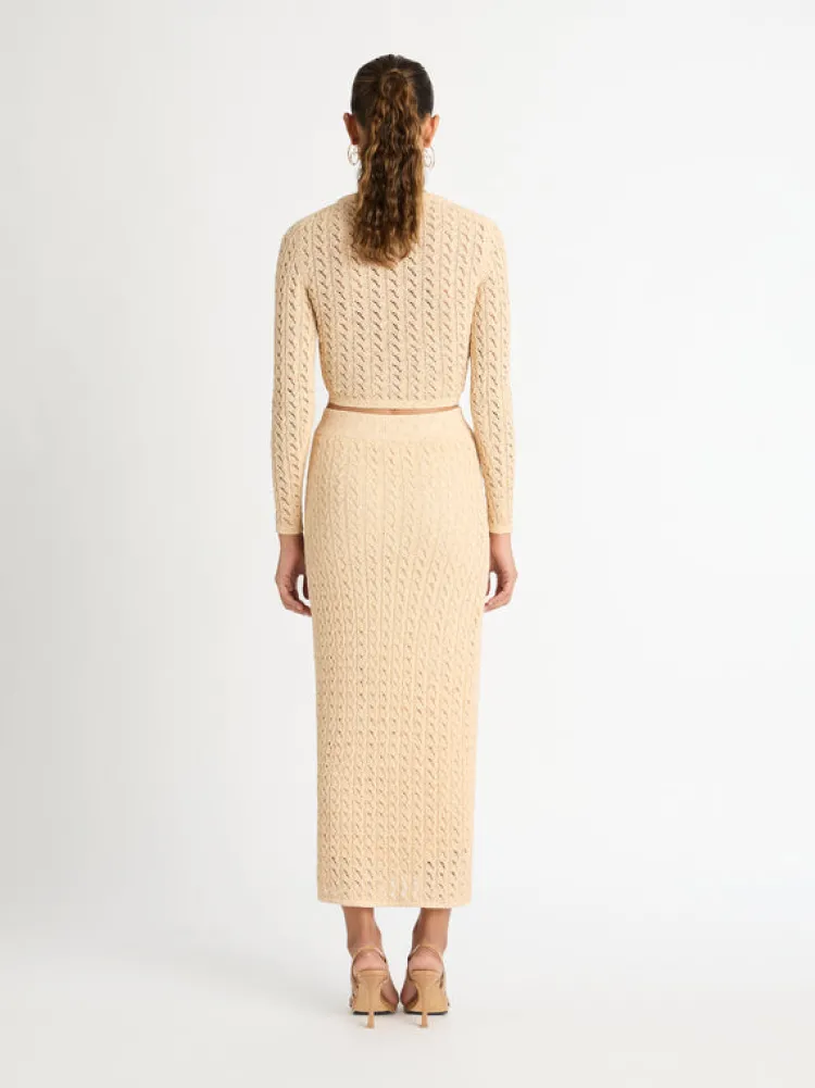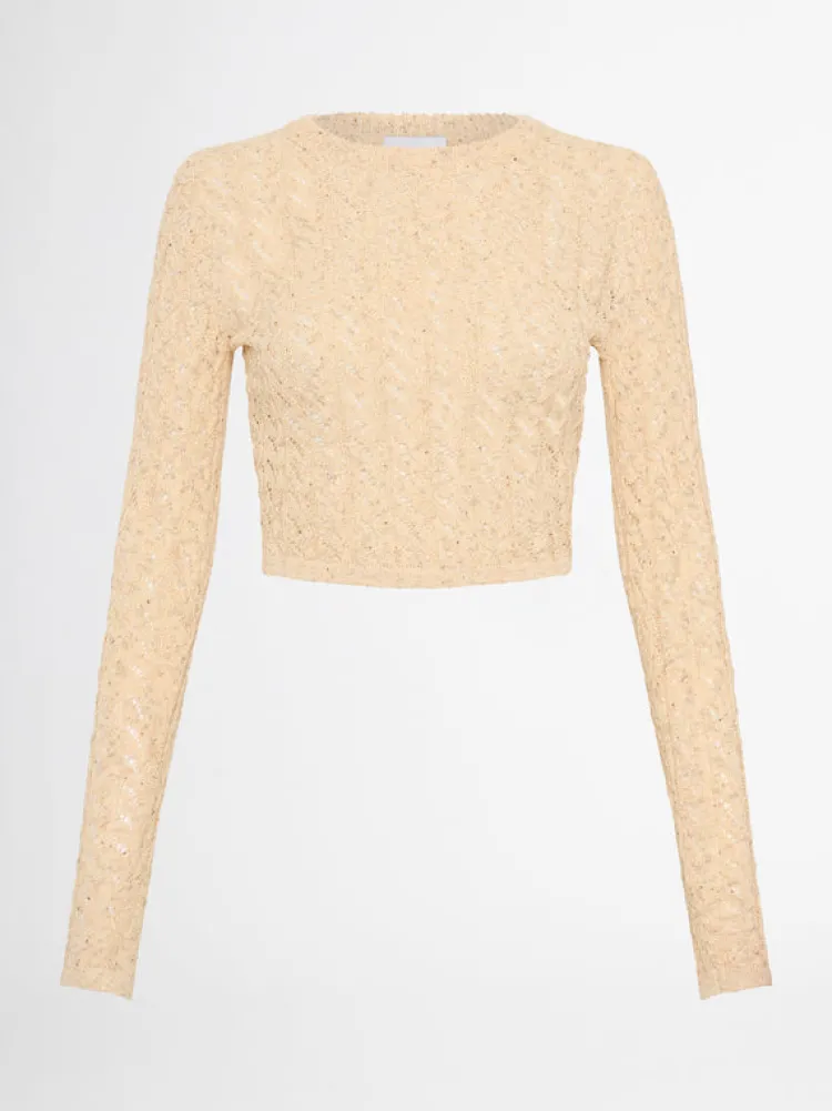 Crochet Inspired By The Decades Gets A Modern Twist. Introducing Our Arabesque Knit Top – Featuring A Slim Fit Cut And Open Weave Stretch Knit. Pair Back With Our Roma Knit Skirt And Sadie Earrings To Complete The Look.