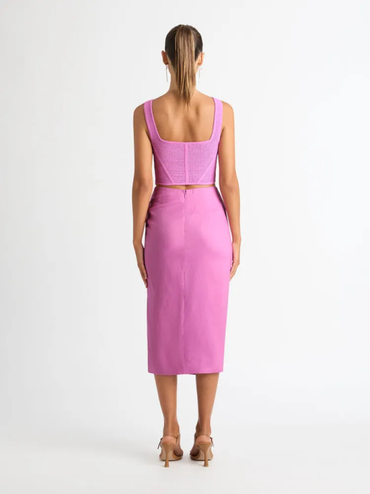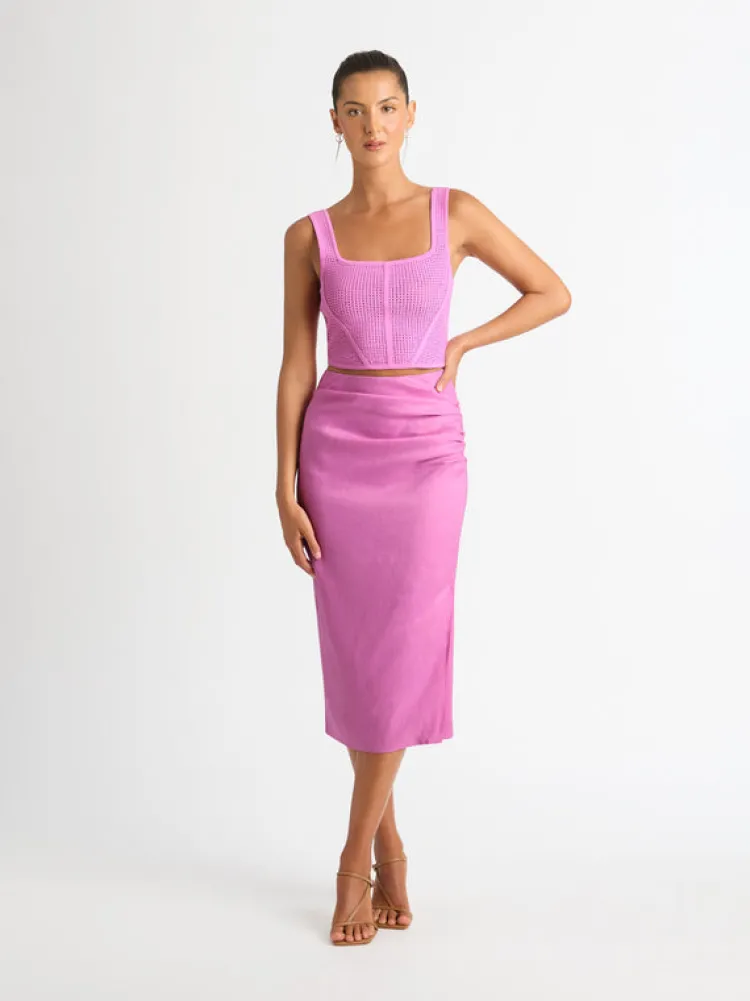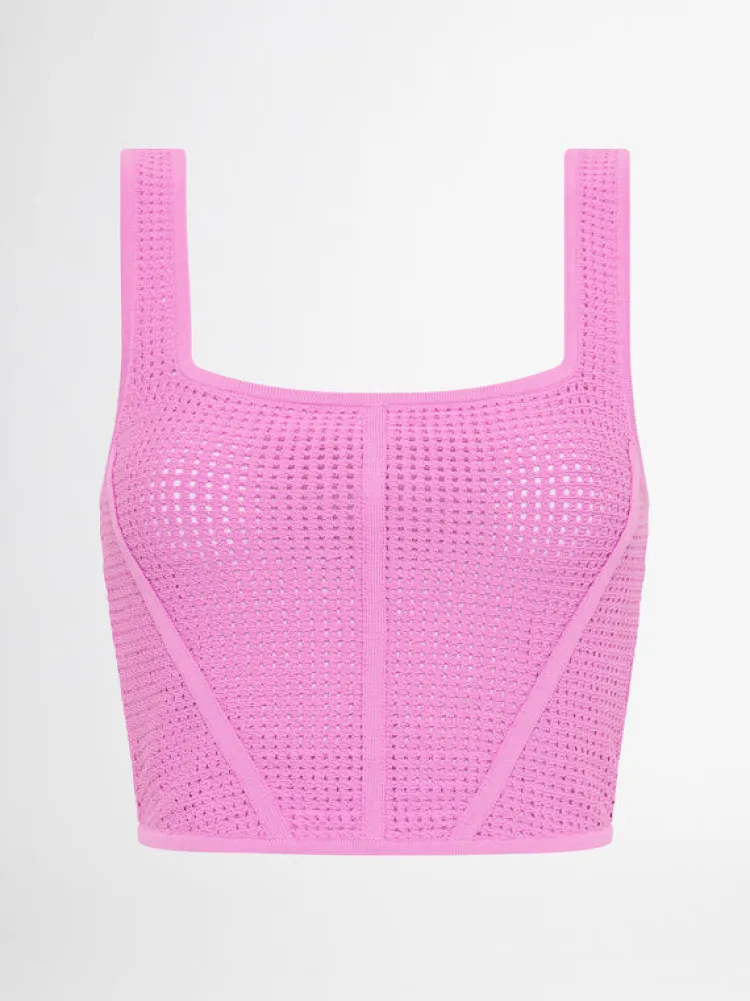 Feminine Pink Hues And Structured Silhouettes. Introducing The Cage Knit Top – Showcasing A Fitted Cut, Square Neckline Binding Detailing Throughout And A Cropped Length. Pair With Our Boardwalk Skirt To Complete The Look.