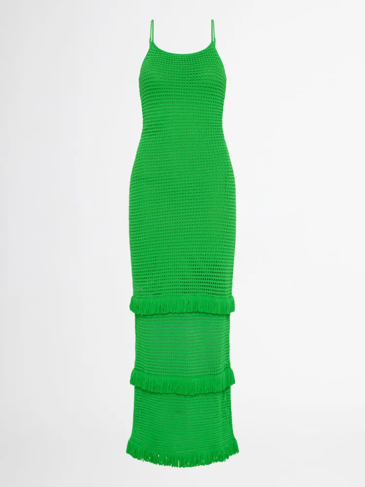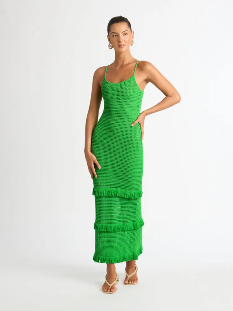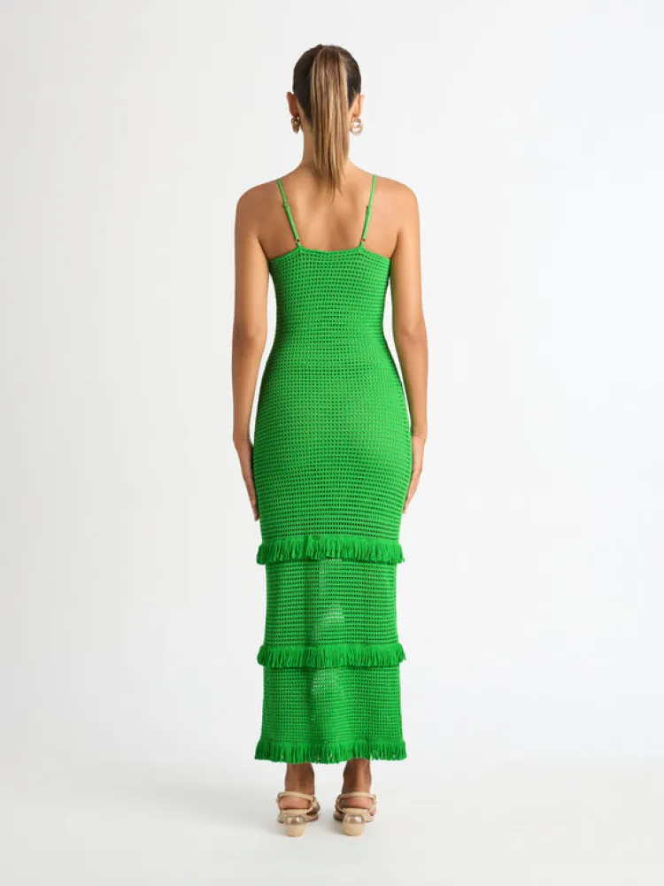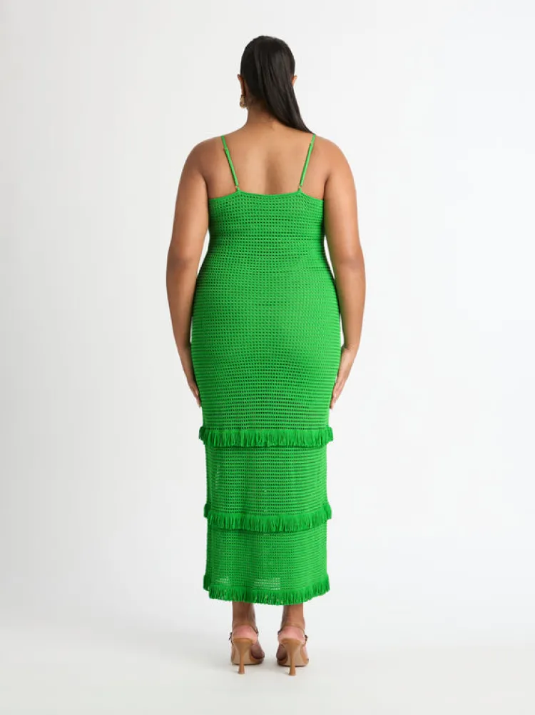 Envious Green Hues And An Intricately Crafted Knit Fabrication Makes Up The Wondrous Tropics Knit Dress. Showcasing A Fitted Cut, With Adjustable Straps And A Tiered Frill Hem. We Recommend Sizing Up Due To The Fitted Nature Of This Dress. Pair With Our Halo Earrings To Complete The Look.