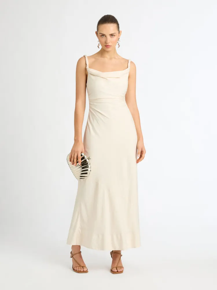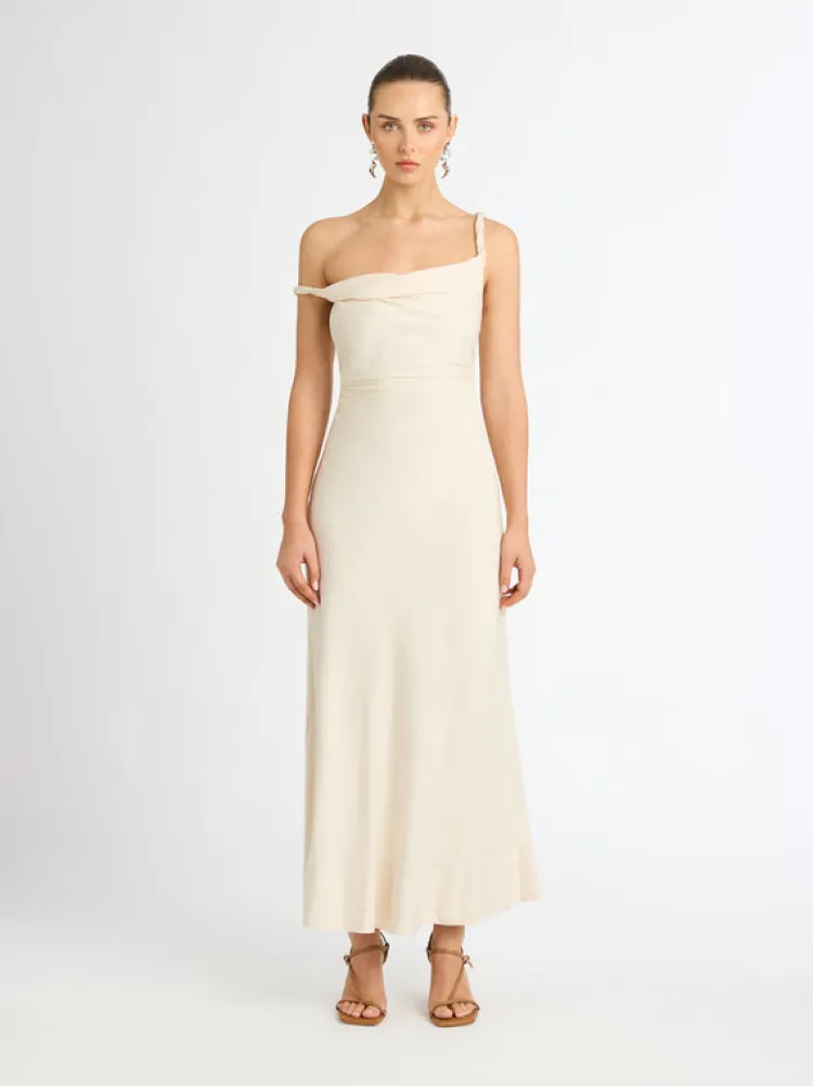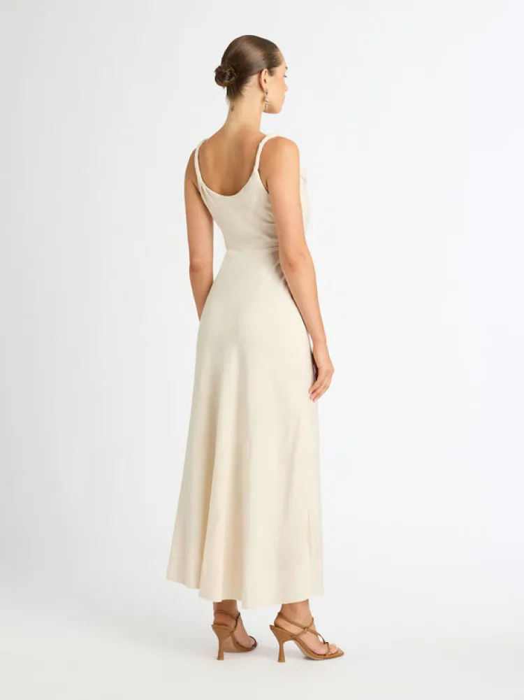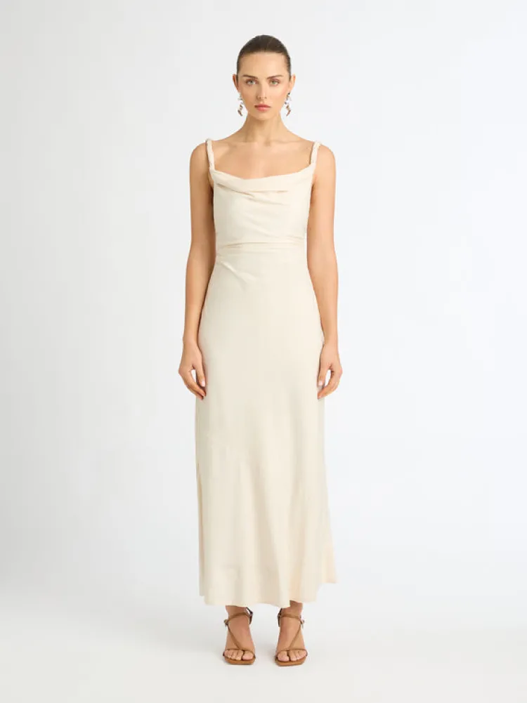 A Much Sought After Sheike Silhouette Is Here – Introducing Our Angelina Midi Dress Featuring A Woven Linen Blend Fabrication, Relaxed Styling, Cowl Neckline, Twisted Strap Detailing, Maxi Length Skirt And Side Seam Zipper. Pair Back With Our Firework Earrings To Complete The Look.
