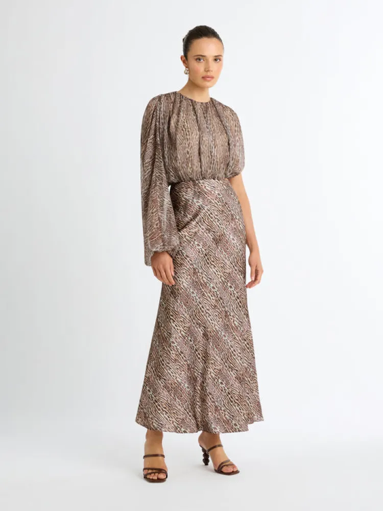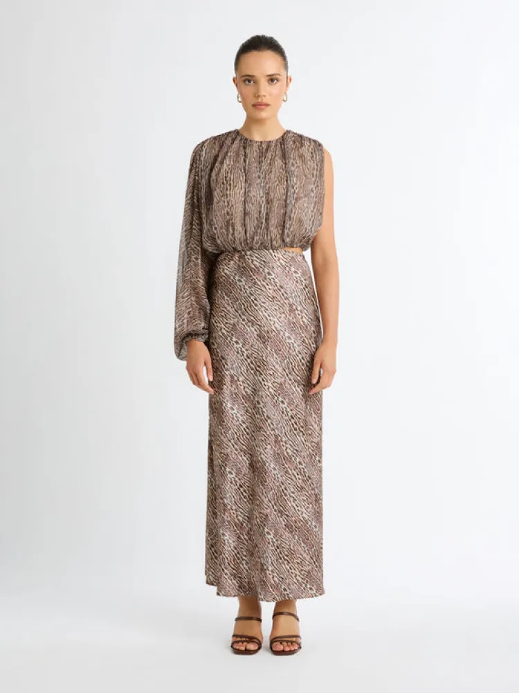Get Ready For The Print Of The Season! Our Moroccan Kingdom Midi Dress Features A Printed Satin And Chiffon Fabrication, High Neckline With One Balloon Sleeve, Midi Bias Skirt, Cut Out At Waist And Keyhole Back. Pair Back With Our Lillian Earrings For A Classic Look.