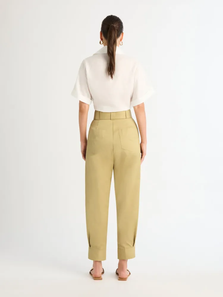 Contemporary Lines And An Alluring Structed Fit Makes The Diego Pant Stand Out From The Rest. Showcasing Fitted And Relaxed Styling, Fixed High Waist With Large Belt Loops, A Self Fabric D Ring Belt With Stitching Design, Side Front And Back Pockets And Tapered Pant Leg With Rolled Hem. Pair With Our Allure Linen Shirt To Complete The Look.