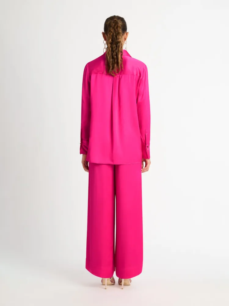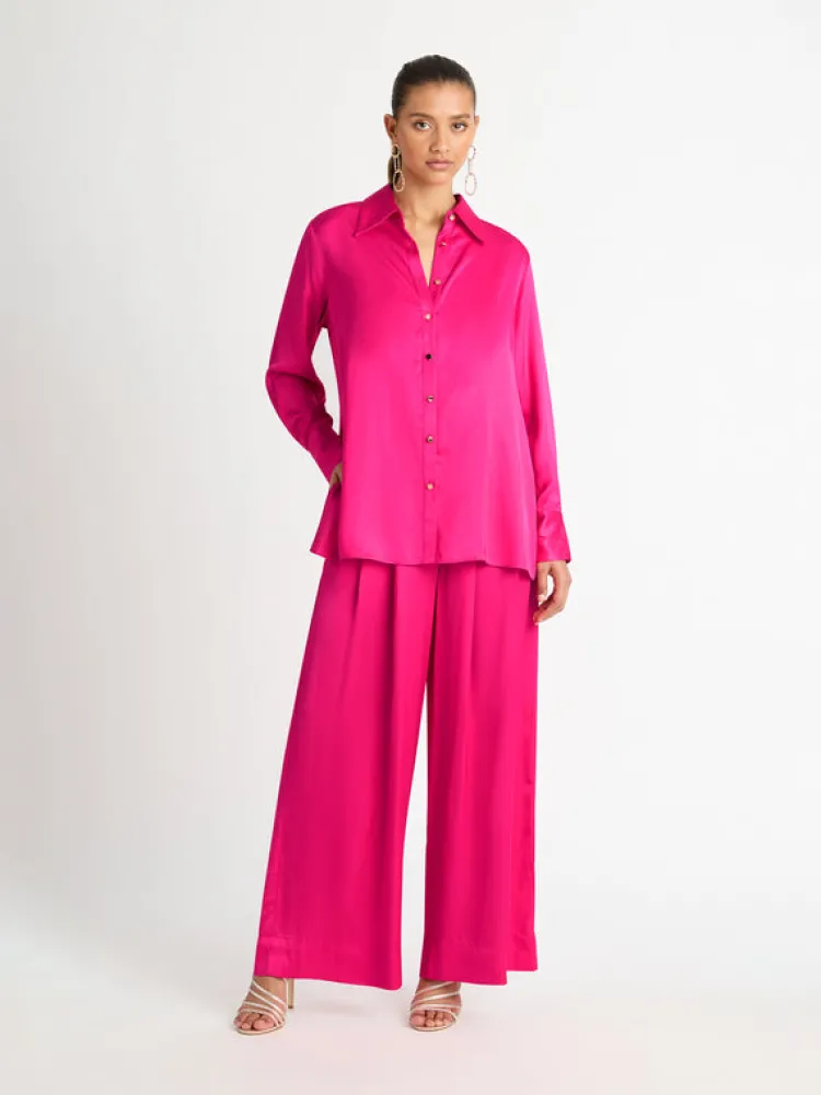 Own Any Room In Our Bold And Elegant Audrey Shirt. Showcasing A Luxe Satin Fabric, Relaxed Cut And Front Placket Button Closure. Pair With Our Gracie Pant And Alora Earrings To Complete The Look.