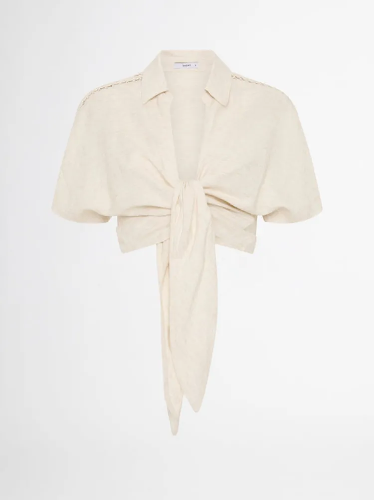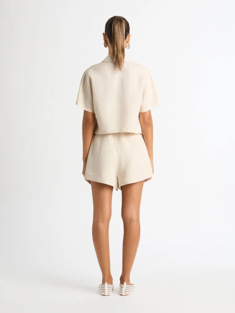 Show Stopping Linen And Soothing Neutral Tones Make Up In Our Milly Shirt. Crafted From Quality Linen Blend Fabrication This Cropped Shirt Showcases A Relaxed Fit, Short Batwing Sleeves And Tie Up Front. Pair With Our Milly Short And Halo Earrings To Complete The Look.