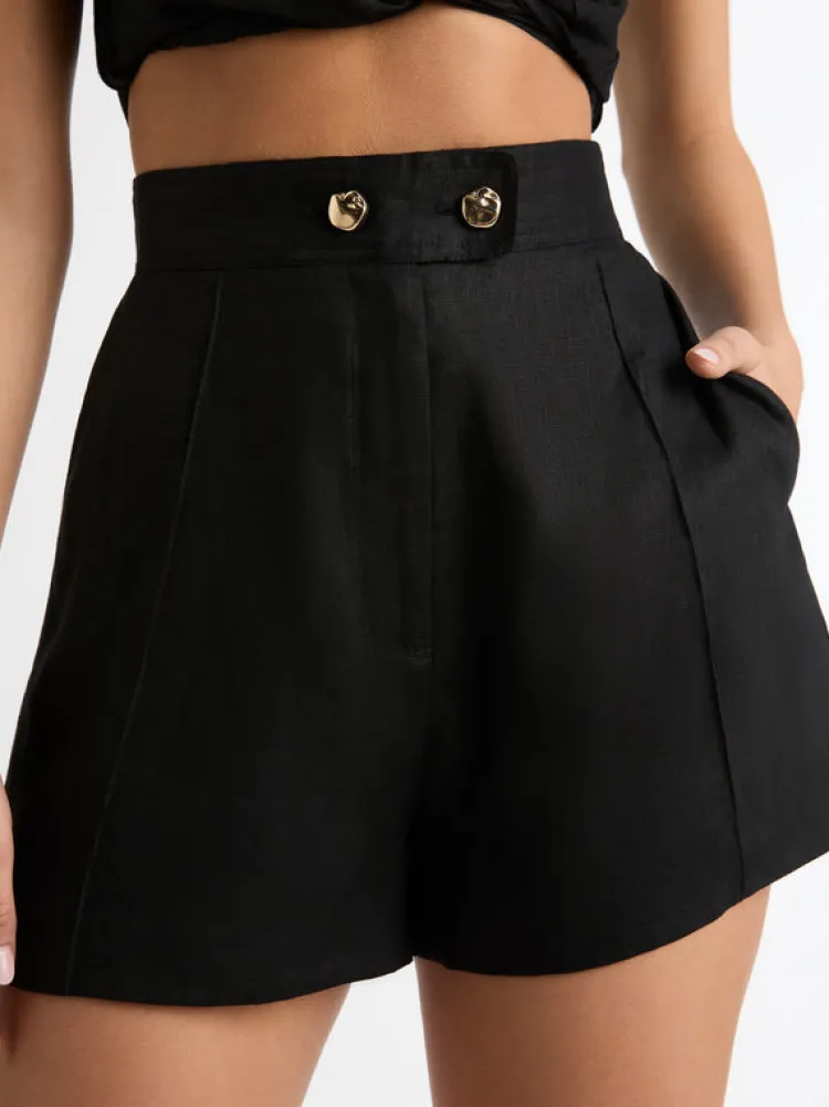 Raven Black Tones Set The Mood This Season. Introducing The Frankie Linen Short, Showcasing A Slim Fit Cut, Fixed Waist And Side Insert Pockets. Pair With Our Matching Frankie Linen Top And Cindy Earrings To Complete The Look.