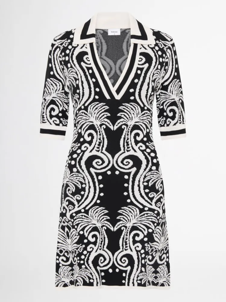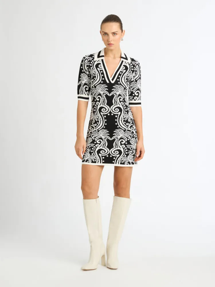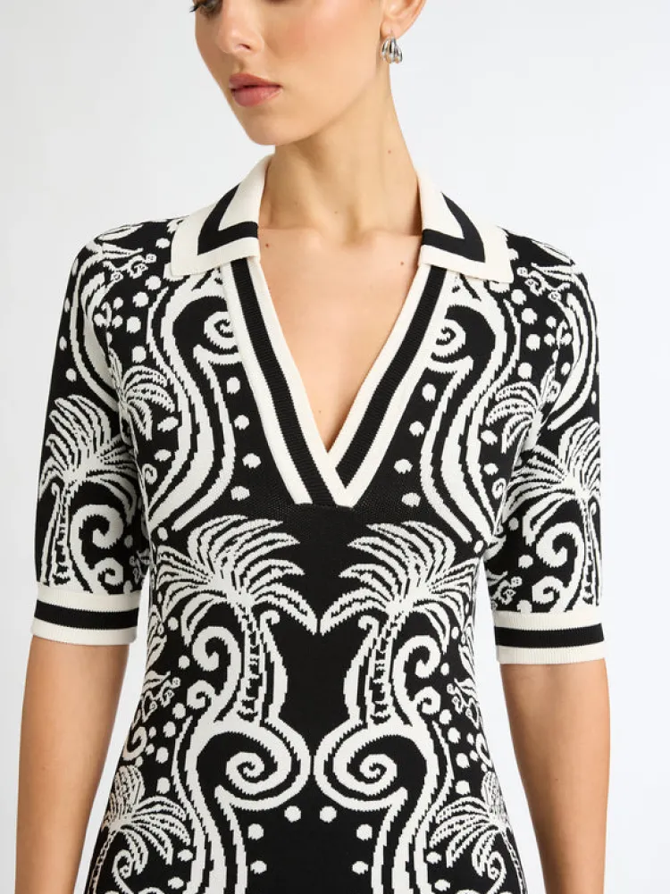 A Captivating Blend Of Tropical Allure And Timeless Elegance. Introducing Our Dolce Palms Mini Dress – Featuring A Jacquard Knit Fabrication, Fitted Styling, Collar Neckline, Ribbing Details At Hem, Cuffs And Neckline, Short Sleeves And Mini Skirt Length. Pair Back With Our Venus Stud Earrings To Complete Your Look.