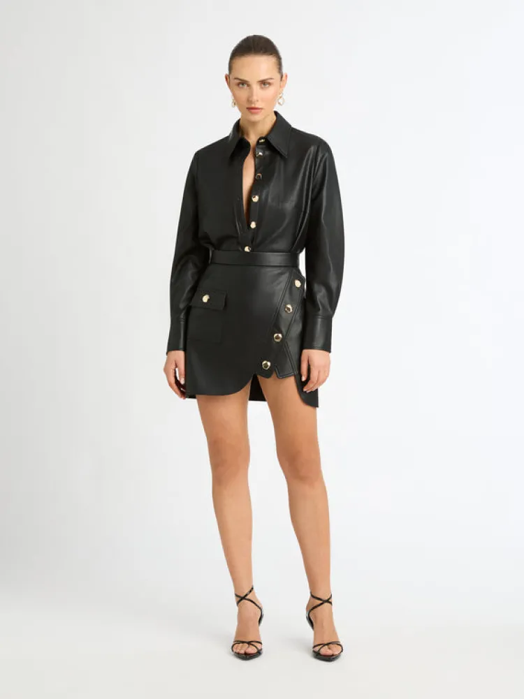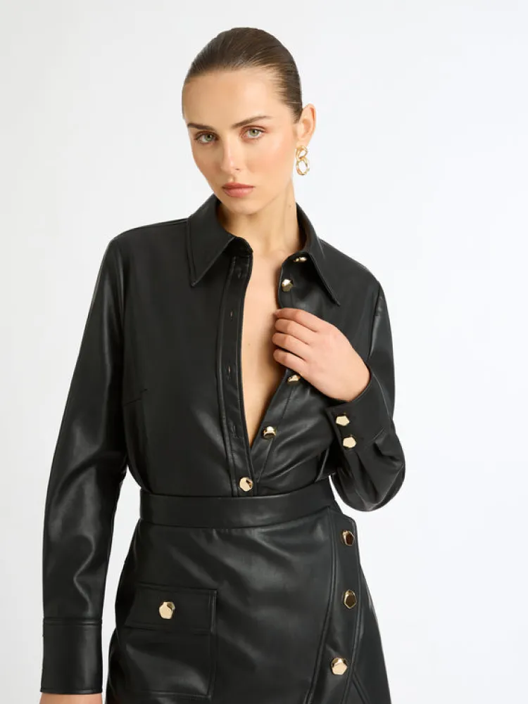 Celebrate Effortless Style With The Elevated Jamie Shirt. Showcasing A Faux Leather Fabrication, Relaxed Cut, Gold Button Stud Closure And Front And Cuffs, Collar Neckline And Long Sleeves. Pair With Our Dillon Skirt And Juliet Earrings To Complete The Look.