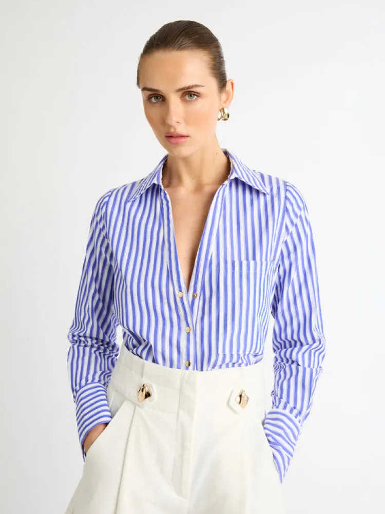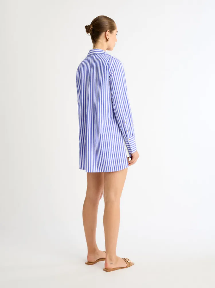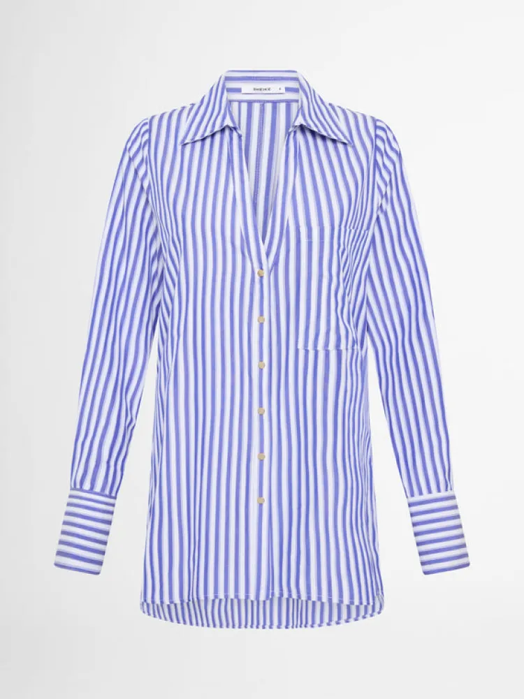 Timeless Stripes And Relaxed Silhouettes Make Up The Stevie Shirt – Showcasing A Collared Neckline And Press Stud Closure On Front Placket Opening And Over Sized Shirt Style. Pair With Our Denim Shorts And Eleni Earrings To Complete The Look.