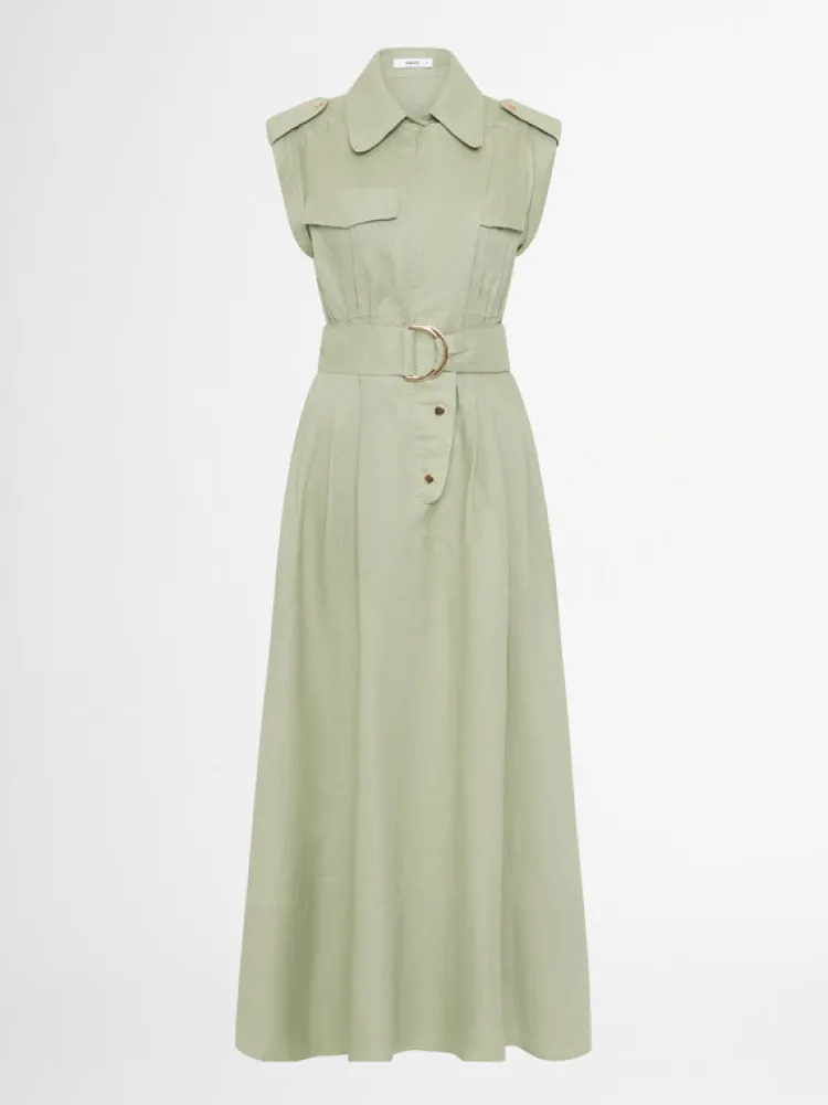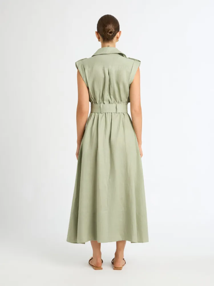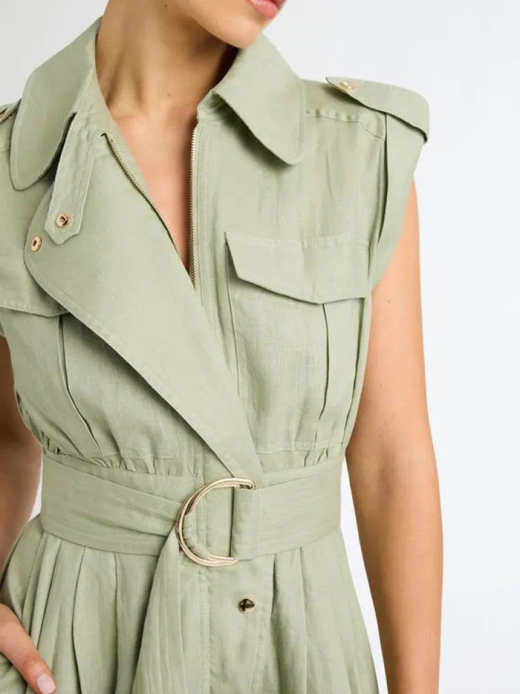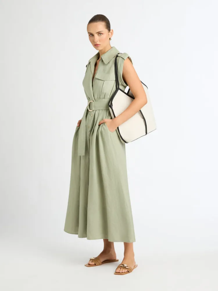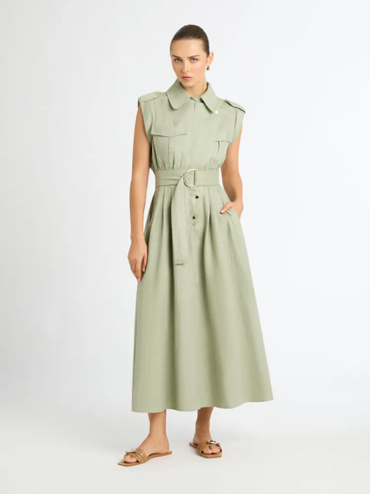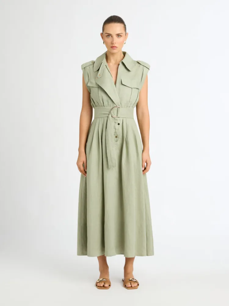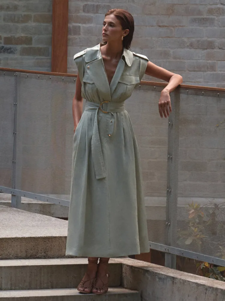 Introducing The Utility Linen Dress – A Perfect Fusion Of Practicality And Effortless Style. A Timeless Addition To Your Wardrobe, Offering Both Functionality And A Touch Of Laid-Back Sophistication. Featuring 100% Linen Fabrication, Front Placket Closure, Patch And Side Seam Pockets, Self Fabric Sash Belt With D Ring And Maxi Length Design. Pair Back With Our Skyscraper Earrings To Complete The Look.